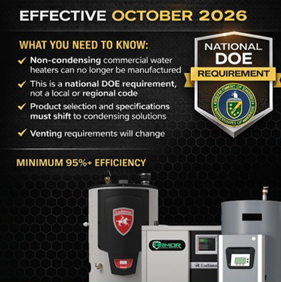 The Department of Energy commercial water heating standards taking effect in October 2026 will significantly impact product availability. Production of many non condensing commercial water heaters will cease.